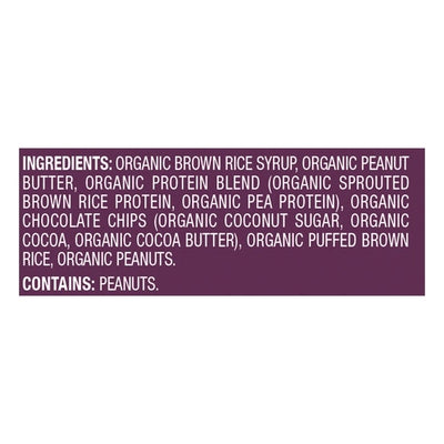 INGREDIENTS: Organic Brown Rice Syrup, Organic Peanut Butter, Organic Protein Blend (Organic Sprouted Brown Rice Protein, Organic Pea Protein), Organic Chocolate Chips (Organic Coconut Sugar, Organic Cocoa, Organic Cocoa Butter), Organic Puffed Brown Rice, Organic Peanuts.