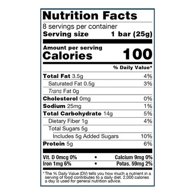 INGREDIENTS: Organic Brown Rice Syrup, Organic Sunflower Seed Butter, Organic Protein Blend (Organic Sprouted Brown Rice Protein, Organic Pea Protein), Organic Gluten-Free Rolled Oats, Organic Chocolate Chips (Organic Coconut Sugar, Organic Cocoa, Organic Cocoa Butter), Organic Crispy Brown Rice (Organic Brown Rice, Organic Brown Rice Syrup, Sea Salt), Organic Maple Sugar, Organic Natural Flavor, Organic Puffed Brown Rice, Sea Salt.