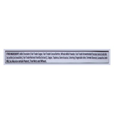 INGREDIENTS: Other Ingredients: Milk Chocolate (Fair Trade Sugar, Fair Trade Cocoa Butter, Whole Milk Powder, Fair Trade Unsweetened Chocolate, Nonfat Dry Milk, Milkfat, Soy Lecithin [an Emulsifier], Fair Trade Natural Vanilla Extract], Sugar, Tapioca, Gum Acacia, Coloring (Vegetable Juice, Turmeric Oleoresin), Carnauba Wax.