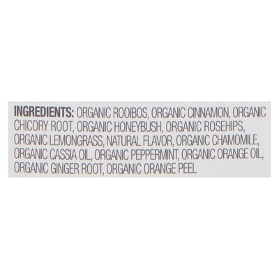 INGREDIENTS: Organic Rooibos, Organic Chicory Root, Organic Cinnamon, Organic Rosehip, Organic Honeybush, Natural Flavor, Organic Lemongrass, Organic Chamomile, Organic Peppermint, Organic Ginger Root, Organic Orange Oil, Organic Orange Peel.