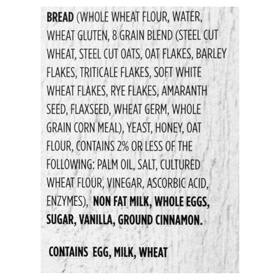INGREDIENTS: Bread (Whole Wheat Flour, Water, Wheat Gluten, 8 Grain Blend (Steel Cut Wheat, Steel Cut Oats, Oat Flakes, Barley Flakes, Triticale Flakes, Soft White Wheat Flakes, Rye Flakes, Amaranth Seed, Flaxseed, Wheat Germ, Whole Grain Corn Meal), Yeast, Honey, Oat Flour, Contains 2% or Less of the Following Palm Oil, Salt, Cultured Wheat Flour, Vinegar, Ascorbic Acid, Enzymes), Non Fat Milk, Whole Eggs, Sugar, Vanilla, Ground Cinnamon.