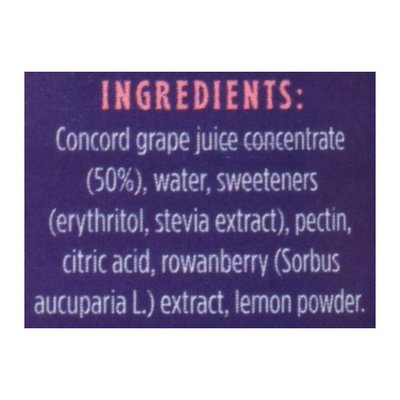 INGREDIENTS: Concord Grape Juice Concentrate (50%), Water, Sweetener (Erythritol, Stevia Extract), Pectin, Citric Acid, Rowanberry (Sorbus Aucuparia L,) Extract, Lemon Powder.