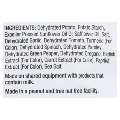 INGREDIENTS: Dehydrated Potato, Potato Starch, Expeller Pressed Sunflower Oil or Safflower Oil, Salt, Dehydrated Garlic, Dehydrated Tomato, Turmeric (for Color), Dehydrated Spinach, Dehydrated Parsley, Dehydrated Green Pepper, Dehydrated Oregano, Radish Extract (for Color), Carrot Extract (for Color), Paprika Extract (for Color), Sea Salt.