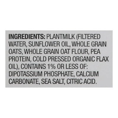 INGREDIENTS: Plantmilk (Filtered Water, Sunflower Oil, Whole Grain Oats, Whole Grain Oat Flour, Pea Protein, Cold Pressed Organic Flax Oil), Contains 1% or Less of: Dipotassium Phosphate, Calcium Carbonate, Sea Salt, Citric Acid.