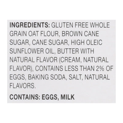 INGREDIENTS: Gluten Free Whole Grain Oat Flour, Brown Cane Sugar, Cane Sugar, High Oleic Sunflower Oil, Butter with Natural Flavor (Cream, Natural Flavor), Contains Less than 2% of Eggs, Baking Soda, Salt, Natural Flavors.