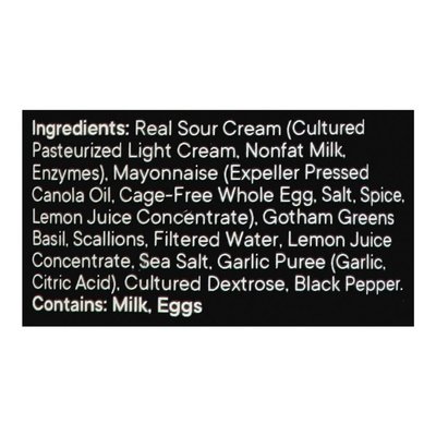 INGREDIENTS: Real Sour Cream (Cultured Pasteurized Light Cream, Nonfat Milk, and Enzymes), Mayonnaise (Expeller Pressed Canola Oil, Cage-Free Egg Yolks, Water, Honey, Distilled Vinegar, Cage-Free Whole Egg, Salt, Spice, Lemon Juice Concentrate), Gotham Greens Basil, Scallions, Filtered Water, Lemon Juice Concentrate, Sea Salt, Garlic Puree (Garlic, Citric Acid), Cultured Dextrose, Black Pepper.