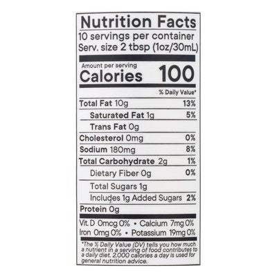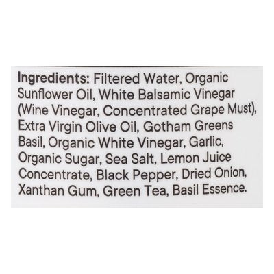 INGREDIENTS: Filtered Water, Organic Sunflower Oil, White Balsamic Vinegar (Wine Vinegar, Concentrated Grape Must), Extra Virgin Olive Oil, Gotham Greens Basil, Organic White Vinegar, Garlic, Organic Sugar, Sea Salt, Lemon Juice Concentrate, Black Pepper, Dried Onion, Xanthan Gum, Green Tea, Basil Essence.