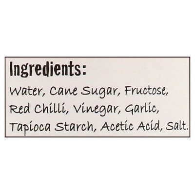 INGREDIENTS: Water, Cane Sugar, Fructose, Red Chilli, Vinegar, Garlic, Tapioca Starch, Acetic Acid, Salt.