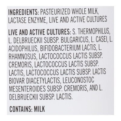 INGREDIENTS: Pasteurized Cultured Whole Milk, Lactase Enzyme, Live and Active Cultures. Live and Active Cultures: S. Thermophilus, L. Delbrueckii Subsp. Bulgaricus, L. Casei, L. Acidophilus, Bifidobacterium Lactis, L. Rhamnosus, Lactococcus Lactis Subsp. Cremoris, Lactococcus Lactis Subsp. Lactis, Lactococcus Lactis Subsp. Lactis Biovar Diacetylactis, Leuconostoc Mesenteroides Subsp. Cremoris, and L. Delbrueckii Subsp. Lactis.