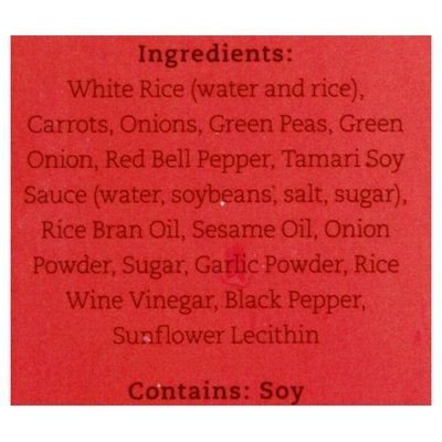 INGREDIENTS: White Rice (Water and Rice), Carrots, Onions, Green Peas, Green Onion, Red Bell Pepper, Tamari Soy Sauce (Water, Soybeans, Salt, Sugar), Rice Bran Oil, Sesame Oil, Onion Powder, Sugar, Garlic Powder, Rice Wine Vinegar, Black Pepper, Sunflower Lecithin.