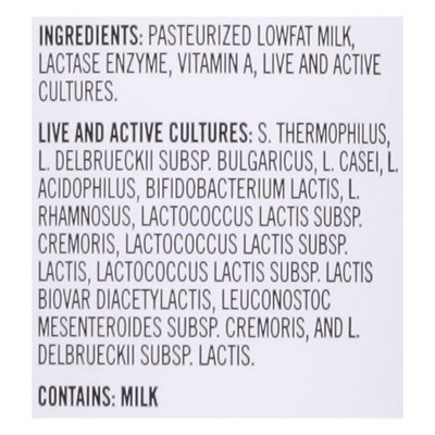 INGREDIENTS: Pasteurized Lowfat Milk, Lactase Enzyme, Vitamin A, Live and Active Cultures. Live and Active Cultures: S. Thermophilus, L. Delbrueckii Subsp. Bulgaricus, L. Casei, L. Acidophilus, Bifidobacterium Lactis, L. Rhamnosus, Lactococcus Lactis Subsp. Cremoris, Lactococcus Lactis Subsp. Lactis, Lactococcus Lactis Subsp. Lactis Biovar Diacetylactis, Leuconostoc Mesenteroides Subsp. Cremoris, and L. Delbrueckii Subsp. Lactis.