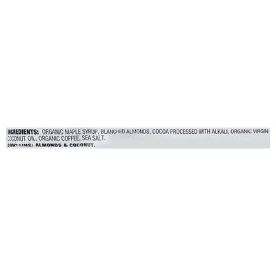 INGREDIENTS: Organic Maple Syrup, Blanched Almonds, Cocoa Processed with Alkali, Organic Virgin Coconut Oil, Organic Coffee, Sea Salt.