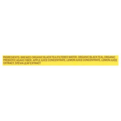 INGREDIENTS: Brewed Organic Black Tea (Filtered Water, Organic Black Tea), Organic Prebiotic Agave Fiber, Apple Juice Concentrate, Lemon Juice Concentrate, Lemon Juice Extract, Stevia Leaf Extract.
