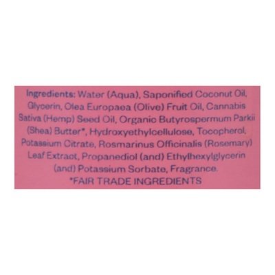 INGREDIENTS: Water (Aqua), Saponified Coconut Oil, Glycerin, Olea Europaea (Olive) Fruit Oil, Cannabis Sativa (Hemp) Seed Oil, Organic Butyrospermum Parkii (Shea) Butter (Fair Trade Ingredients), Hydroxyethylcellulose, Tocopherol, Potassium Citrate, Rosmarinus Officinalis (Rosemary) Leaf Extract, Propanediol (and) Ethylhexylglycerin (and) Potassium Sorbate, Fragrance.