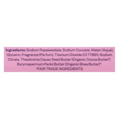 INGREDIENTS: Sodium Rapeseedate, Sodium Cocoate, Water (Aqua), Glycerin, Fragrance (Parfum), Titanium Dioxide (CI 77891), Sodium Citrate, Theobroma Cacao Seed Butter (Organic Cocoa Butter) (Fair Trade Ingredients) Butyrospermum Parkii Butter (Organic Shea Butter) (Fair Trade Ingredients).