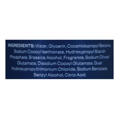 INGREDIENTS: Water, Glycerin, Cocamidopropyl Betaine, Sodium Cocoyl Isethionate, Hydroxypropyl Starch Phosphate, Brassica Alcohol, Fragrance, Sodium Olivoyl Glutamate, Disodium Cocoyl Glutamate, Guar Hydroxypropyltrimonium Chloride, Sodium Benzoate, Benzyl Alcohol, Citric Acid.