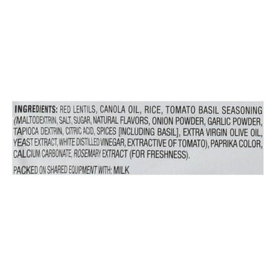 INGREDIENTS: Red Lentils, Canola Oil, Rice, Tomato Basil Seasoning (Maltodextrin, Salt, Sugar, Natural Flavors, Onion Powder, Garlic Powder, Tapioca Dextrin, Citric Acid, Spices (Including Basil], Extra Virgin Olive Oil, Yeast Extract White Distilled Vinegar, Extractive of Tomato), Paprika Color, Calcium Carbonate, Rosemary Extract (for Freshness).