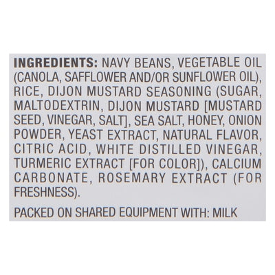 INGREDIENTS: Navy Beans, Vegetable Oil (Canola, Safflower and/or Sunflower Oil), Rice, Dijon Mustard Seasoning (Sugar, Maltodextrin, Dijon Mustard [Mustard Seed, Vinegar, Salt], Sea Salt, Honey, Onion Powder, Yeast Extract, Natural Flavor, Citric Acid, White Distilled Vinegar, Turmeric Extract [for Color]), Calcium Carbonate, Rosemary Extract (for Freshness).
