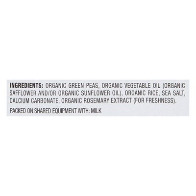 INGREDIENTS: Organic Green Peas, Organic Vegetable Oil (Organic Safflower and/or Organic Sunflower Oil), Organic Rice, Sea Salt, Calcium Carbonate, Organic Rosemary Extract (for Freshness).