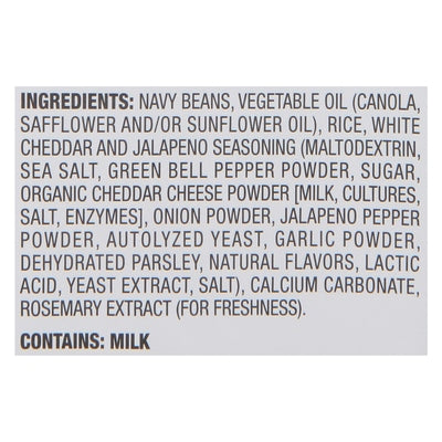 INGREDIENTS: Navy Beans, Vegetable Oil (Canola, Safflower and/or Sunflower Oil), Rice, White Cheddar and Jalapeno Seasoning (Maltodextrin, Sea Salt, Green Bell Pepper Powder, Sugar, Cheddar Cheese Powder [Milk, Cultures, Salt, Enzymes], Onion Powder, Jalapeno Pepper Powder, Autolyzed Yeast, Garlic Powder Dehydrated Parsley, Natural Flavors, Lactic Acid, Butter [Cream, Natural Flavor], Yeast Extract, Nonfat Dry Milk, Whey Solids, Salt), Calcium Carbonate, Rosemary Extract (for Freshness).