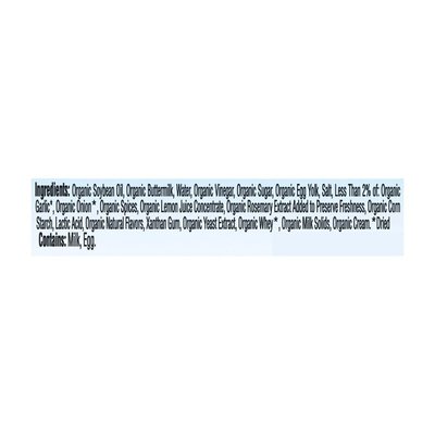 INGREDIENTS: Organic Soybean Oil, Water, Organic Buttermilk, Water, Organic Vinegar, Organic Sugar, Organic Egg Yolk, Salt, Less than 2% of: Organic Garlic (Dried), Organic Onion (Dried), Organic Spices, Organic Lemon Juice Concentrate, Organic Rosemary Extract Added to Preserve Freshness, Organic Corn Starch, Lactic Acid, Organic, Natural Flavors, Xanthan Gum, Organic Yeast Extract, Organic Whey (Dried), Organic Milk Solids, Organic Cream.