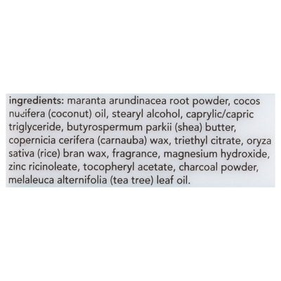 INGREDIENTS: Maranta Arundinacea Root Powder, Cocos Nucifera (Coconut) Oil, Stearyl Alcohol, Caprylic/Capric Triglyceride, Butyrospermum Parkii (Shea) Butter, Copernicia Cerifera (Carnauba) Wax, Triethyl Citrate, Oryza Sativa (Rice) Bran Wax, Fragrance, Magnesium Hydroxide, Zinc Ricinoleate, Tocopheryl Acetate, Charcoal Powder, Melaleuca Alternifolia (Tea Tree) Leaf Oil.
