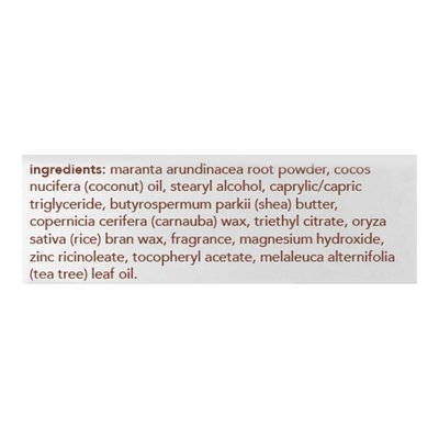 INGREDIENTS: Maranta Arundinacea Root Powder, Cocos Nucifera (Coconut) Oil, Stearyl Alcohol, Caprylic/Capric Triglyceride, Butyrospermum Parkii (Shea) Butter, Copernicia Cerifera (Carnauba) Wax, Triethyl Citrate, Oryza Sativa (Rice) Bran Wax, Fragrance, Magnesium Hydroxide, Zinc Ricinoleate, Tocopheryl Acetate, Melaleuca Alternifolia (Tea Tree) Leaf Oil.