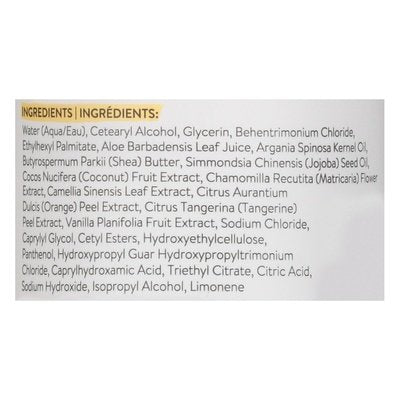INGREDIENTS: Water (Aqua/Eau), Cetearyl Alcohol, Glycerin, Behentrimonium Chloride, Ethylhexyl Palmitate, Aloe Barbadensis Leaf Juice, Argania Spinosa Kernel Oil, Butyrospermum Parkii (Shea) Butter, Simmondsia Chinensis (Jojoba) Seed Oil, Cocos Nucifera (Coconut) Fruit Extract, Chamomilla Recutita (Matricaria) Flower Extract, Camellia Sinensis Leaf Extract, Citrus Aurantium Dulcis (Orange) Peel Extract, Citrus Tangerina (Tangerine) Peel Extract, Vanilla Planifolia Fruit Extract, Sodium Chloride, Caprylyl Glycol, Cetyl Esters, Hydroxyethylcellulose, Panthenol, Hydroxypropyl Guar Hydroxypropyltrimonium Chloride, Caprylhydroxamic Acid, Triethyl Citrate, Citric Acid, Sodium Hydroxide, Isoprpyl Alcohol, Limonene.