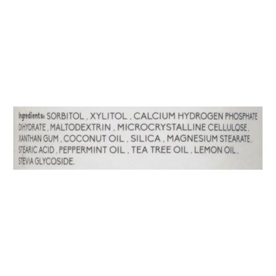 INGREDIENTS: Sorbitol, Xylitol, Calcium Hydrogen Phosphate, Dihydrate, Maltodextrin, Microcrystalline Cellulose, Xanthan Gum, Coconut Oil, Silica, Magnesium Stearate, Stearic Acid, Peppermint Oil, Tea Tree Oil, Lemon Oil, Stevia Glycoside.