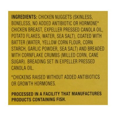 INGREDIENTS: Chicken Nuggets (Skinless, Boneless, No Added Antibiotic or Hormone (Chickens Raised Without Added Antibiotics or Growth Hormones, Federal Regulations Prohibit the Use of Added Hormones in Poultry) Chicken Breast, Canola Oil, Potato Flakes, Water, Sea Salt), Coated with Batter (Water, Yellow Corn Flour, Corn Starch, Garlic Powder, Sea Salt) and Breaded with Cornflake Crumbs (Milled Corn, Cane Sugar), Breading Set in Canola Oil.