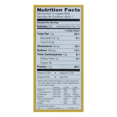 PRODUCT DETAILS: 0 g trans fat per serving. No wheat or gluten. No milk or casein. No eggs. No peanuts or tree nuts. No soy. Excellent source of protein. Trust made simple. Made with chicken raised with no antibiotics. Made with white meat chicken. Uncooked. Ian's Allergy-Friendly (This product does not contain any ingredients derived from wheat, soy, eggs, milk, tree nuts or peanuts) Gluten Free Chicken Nuggets make mealtime for the entire family easy and delicious! We start with cage-free (Chicken flock was able to freely roam a building, room or area with unrestricted access to food and fresh water during their production cycle) white meat chicken, raised without antibiotics. Then we shape them into nuggets, enrobe and coat them in our very own gluten-free corn breading for a crispy, fresh taste every time. That's what we call Trust made simple! You and your family can trust Ian's because our food is made with high-quality ingredients; no preservatives, artificial ingredients, flavors or colors so they taste great! Ian's gluten-free foods are easy to prepare and easy to have on-hand in the freezer. Ian's provides a wide selection of quality center-plate meal solutions & breakfast items that the whole family will enjoy! And for the home-chef, try Ian's a selection of gluten-free breadcrumbs are available in the grocery aisle. We know managing food allergies isn't simple. With Ian's it can be! Made with cage free (Chicken flock was able to freely roam a building, room or area with unrestricted access to food and fresh water during their production cycle) white meat chicken raised without antibiotics. Inspected for wholesomeness by U.S. Department of Agriculture. www.iansnaturalfoods.com. Facebook. Twitter. Pinterest. See our entire line-up of meal solutions at www.iansnaturalfoods.com. Try out other Family Pack Allergy Friendly (This product does not contain any ingredients derived from wheat, soy, eggs, milk, tree nuts or peanuts) meal solutions! 100% recycled paperboard. This package is recyclable, please recycle. Made in U.S.A.