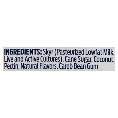 INGREDIENTS: Skyr (Pasteurized Lowfat Milk, Live and Active Cultures), Cane Sugar, Coconut, Pectin, Natural Flavor, Carob Bean Gum. Live and Active Cultures: Including Heirloom Skyr Cultures (Streptococcus Thermophilus Islandicus), Lactobacillus Bulgaricus, Bifidobacterium.