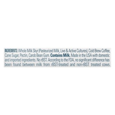INGREDIENTS: Whole Milk Skyr (Pasteurized Grade A Milk, Nonfat Milk, Live & Active Cultures), Cold Brew Coffee, Cane Sugar, Pectin, Carob Bean Gum. Live and Active Cultures: Heirloom Skyr Cultures (Streptococcus Thermophilus Islandicus), Lactobacillus Bulgaricus, Bifidobacterium.