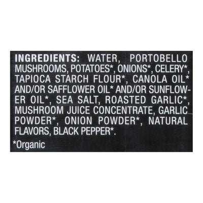 INGREDIENTS: Filtered Water, Portobello Mushrooms, Organic Potatoes, Organic Onions, Organic Celery, Organic Tapioca Starch, Organic Expeller Pressed Canola Oil and/or Organic Safflower Oil and/or Organic Sunflower Oil, Sea Salt, Organic Roasted Garlic, Mushroom Juice Concentrate, Organic Garlic Powder, Organic Onion Powder, Natural Flavors, Organic Spices.