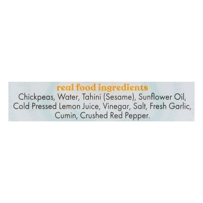 INGREDIENTS: Chickpeas, Water, Tahini, Organic Sunflower Oil, Cold Pressed Lemon Juice, Vinegar, Salt, Fresh Garlic, Cumin, Crushed Red Pepper.