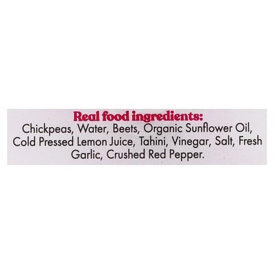 INGREDIENTS: Chickpeas, Water, Beets, Sunflower Oil, Cold Pressed Lemon Juice, Tahini (Sesame), Vinegar, Salt, Fresh Garlic, Crushed Red Pepper.