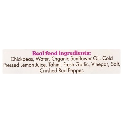 INGREDIENTS: Real Food Ingredients: Chickpeas, Water, Organic Sunflower Oil, Cold Pressed Lemon Juice, Tahini, Fersh Garlic, Vinegar Salt, Crushed Red Pepper.