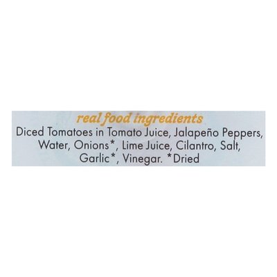 INGREDIENTS: Real Food Ingredients: Diced Tomatoes in Tomato Juice, Jalapeno Peppers, Water, Onions (Dried), Lime Juice, Cilantro, Salt, Garlic (Dried), Vinegar.