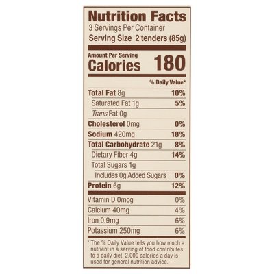 PRODUCT DETAILS: Vegan jackfruit tenders. Vegan. Gluten free. Good source of protein from plants. 42% Less fat than chicken tenders (Chicken Tenders contain 12g Total Fat per Serving (84g). Jack & Annie's Crispy Jack Tenders contain 9g Total Fat per Serving (85g)). 4 g good source of fiber. Non-GMO. New. Ready to cook. Hi, I'm Annie! Growing up eating meat, I knew I should eat more plants - but I wanted more from them. The deliciousness of meat, without all kinds of processing. I searched the world over for a better way to enjoy plant-first foods until I found the perfect plant, Jackfruit. Meet Jack - short for Jackfruit! Jack, grown on the wild Jack Tree, is a real, whole plant that eats like your favorite meat, naturally. Prepared simply with seasonings and sauces, It's as satisfying as it is juicy. And it's better for you, for farmers, and our planet. Whole Jack - Always our first ingredient. jackandannies.com. Facebook. Instagram. Twitter. (at)jackandannies.