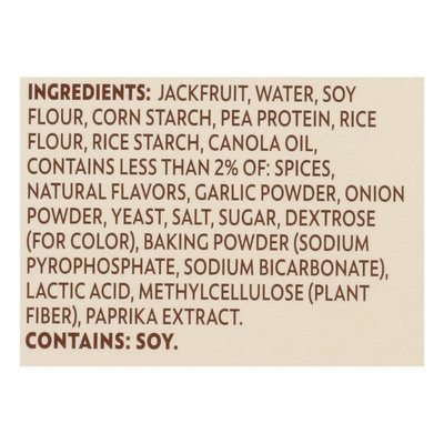 INGREDIENTS: Jackfruit, Water, Rice Flour, Soy Flour, Corn Starch, Canola Oil, Less than 2% of: Garlic Powder, Onion Powder, Natural Flavor, Pea Protein, Rice Starch, Salt, Methylcellulose (Plant Fiber), Baker's Yeast, Sugar, Spices, Baking Powder (Sodium Acid Pyrophosphate, Baking Soda), Sunflower Oil, Dextrose, Paprika Extract, Yeast.