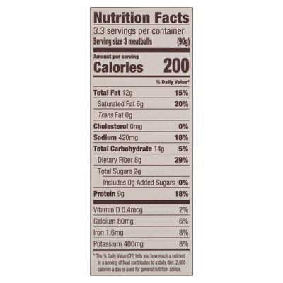 PRODUCT DETAILS: Vegan jackfruit meatballs. 29% less fat than Italian meatballs (Italian meatballs contain 19 g total fat per serving [85 g]. Jack & Annie's Jack Meatballs contain 13 g total fat per serving [82 g]). Gluten free. Made without gluten. Vegan. Good source of protein from plants. Good source of fiber. Our best new recipe yet. Hi, I'm Annie! Growing up eating meat, I knew I should eat more plants - but I wanted more from them. The deliciousness of meat, without all kinds of processing. I searched the world over for a better way to enjoy plant-first foods until I found the perfect plant, jackfruit. Meet Jack - short for jackfruit! Jack, grown on the wild jack tree, is a real, whole plant that eats like your favorite meat, naturally. Prepared simply with seasonings and sauces, it's as satisfying as it is juicy. And it's better for you, for farmers, and our planet. Whole Jack: Always our first ingredient. jackandannies.com. Facebook. Instagram. Twitter. (at)jackandannies. Additional cooking instructions available at jackandannies.com.