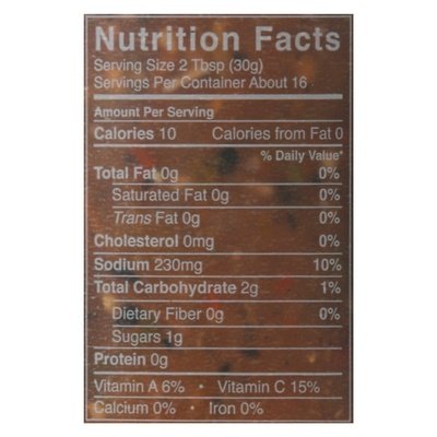 INGREDIENTS: Tomatoes, Red Bell Peppers, Onions, Jalapeno Peppers, Lime Juice, Garlic, Sea Salt, Cilantro, Red Wine Vinegar, Spices.