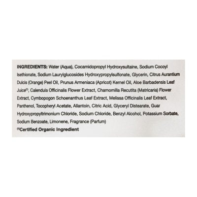 INGREDIENTS: Water (Aqua), Cocamidopropyl Hydroxysultaine, Sodium Cocoyl Isethionate, Sodium Laurylglucosides Hydroxypropylsulfonate, Glycerin, Citrus Aurantium Dulcis (Orange) Peel Oil, Prunus Armeniaca (Apricot) Kernel Oil, Aloe Barbadensis Leaf Juice (Certified Organic Ingredient), Calendula Officinalis Flower Extract, Chamomilla Recutita (Matricaria) Flower Extract, Cymbopogon Schoenanthus Leaf Extract, Melissa Officinalis Leaf Extract, Panthenol, Tocopheryl Acetate, Allantoin, Citric Acid, Glyceryl Distearate, Guar Hydroxypropyltrimonium Chloride, Sodium Chloride, Benzyl Alcohol, Potassium Sorbate, Sodium Benzoate, Limonene, Fragrance (Parfum).
