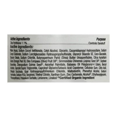 INGREDIENTS: Active Ingredients: Zinc Pyrithione (1.0%). Purpose: Controls Dandruff. Inactive Ingredients: Aqua (Water), Lauryl Glucoside, Glycerin, Sodium Coco-Sulfate, Sodium Cocoyl Isethionate, Glycol Stearate, Olea Europaea (Olive) Fruit Oil (Certified Organic Ingredient), Simmondsia Chinensis (Jojoba) Seed Oil (Certified Organic Ingredient), Babassu Oil Polyglyceryl-4 Esters, Cetyl Alcohol, Coco-Glucoside, Hydrolyzed Wheat Protein, Glyceryl Oleate, Magnesium Sulfate, Polyquaternium-10, Sodium PCA, Sodium Sulfate, Zinc Carbonate, Benzyl Alcohol, Alpha-Isomethyl Ionone, Butylphenyl Methylpropional, Fragrance (Parfum).