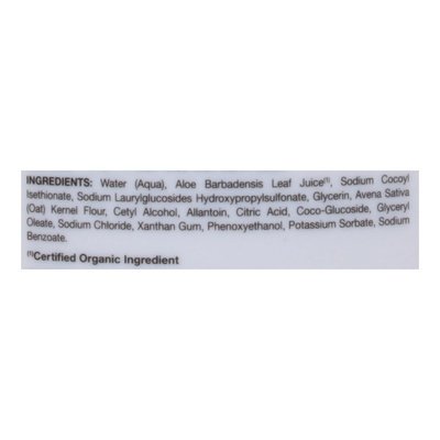 INGREDIENTS: Water (Aqua), Aloe Barbadensis Leaf Juice (Certified Organic Ingredient), Sodium Cocoyl Isethionate, Sodium Laurylglucosides Hydroxypropylsulfonate, Glycerin, Avena Sativa (Oat) Kernel Flour, Cetyl Alcohol, Allantoin, Citric Acid, Coco-Glucoside, Glyceryl Oleate, Sodium Chloride, Xanthan Gum, Phenoxyethanol, Potassium Sorbate, Sodium Benzoate.