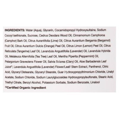INGREDIENTS: Water (Aqua), Glycerin, Cocamidopropyl Hydroxysultaine, Sodium Cocoyl Isethionate, Sucrose, Cedrus Deodara Wood Oil, Cinnamomum Camphoroa (Camphor) Bark Oil, Citrus Aurantifolia (Lime) Oil, Citrus Aurantium Bergamia (Bergamot) Fruit Oil, Citrus Aurantium Dulcis (Orange) Peel Oil, Citrus Limon (Lemon) Peel Oil, Citrus Reticulata (Tangerine) Leaf Oil, Lavandula Angustifolia (Lavender) Oil, Lavandula Hybrida on, Melaieuca Alternifolia (Tea Tree) Leaf Oil, Mentha Piperita (Peppermint) Oil, Pelargonium Graveolens Flower Oil, Salvia Sclarea (Clary) Oil, Aloe Barbadensis Leaf Juice (Certified Organic Ingredient), Lavandula Angustifolia (Lavender) Flower/Leaf/Stem Extract, Panthenol, Citric Acid, Glyceryl Distearate, Glyceryl Stearate, Guar Hydroxypropyltrimonium Chloride, Linalyl Acetate, Sodium Chloride, Sodium Laurylglucosides Hydroxypropylsulfonate, Stearic Acid, Triethyl Citrate, Benzyl Alcohol, Potassium Sorbate, Sodium Benzoate, Linalool.