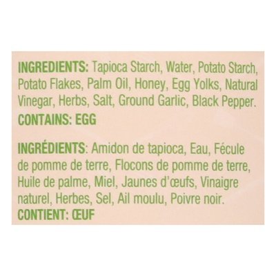 INGREDIENTS: Tapioca Starch, Water, Potato Starch, Potato Flakes, Palm Oil, Honey, Egg Yolks, Natural Vinegar, Herbs, Salt, Ground Garlic, Black Pepper.