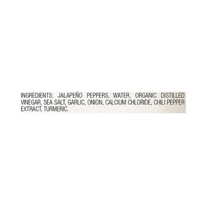 INGREDIENTS: Jalapeno Peppers, Organic Distilled Vinegar, Water, Sea Salt, Calcium Chloride, Garlic, Onion, Chili Pepper Extract, Turmeric.