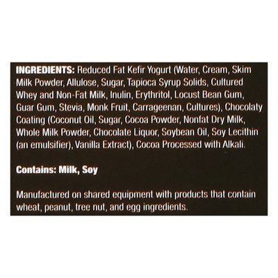 INGREDIENTS: Reduced Fat Kefir Yogurt (Water, Cream, Skim Milk Powder, Allulose, Sugar, Tapioca Syrup Solids, Cultured Whey and Non-Fat Milk, Inulin, Erythritol, Locust Bean Gum, Guar Gum, Stevia, Monk Fruit, Carrageenan, Cultures), Chocolaty Coating (Coconut Oil, Sugar Cocoa Powder, Nonfat Dry Milk, Whole Milk Powder, Chocolate Liquor, Soybean Oil, Soy Lecithin (an Emulsifier), Vanilla Extract), Cocoa Processed with Alkali.