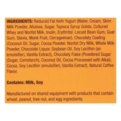 INGREDIENTS: Reduced Fat Kefir Yogurt (Water, Cream, Skim Milk Powder, Allulose, Sugar, Tapioca Syrup Solids, Cultured Whey and Nonfat Milk, Inulin, Erythritol, Locust Bean Gum, Guar Gum, Stevia, Monk Fruit, Carrageenan, Cultures), Chocolaty Coating (Coconut Oil, Sugar, Cocoa Powder, Nonfat Dry Milk, Whole Milk Powder, Chocolate Liquor, Soybean Oil, Soy Lecithin (an Emulsifier), Vanilla Extract), Semisweet Chocolate Drop (Sugar, Chocolate Liquor, Cocoa Butter, Sunflower Lecithin (an Emulsifier), Vanilla Extract), Natural Coffee Flavor.